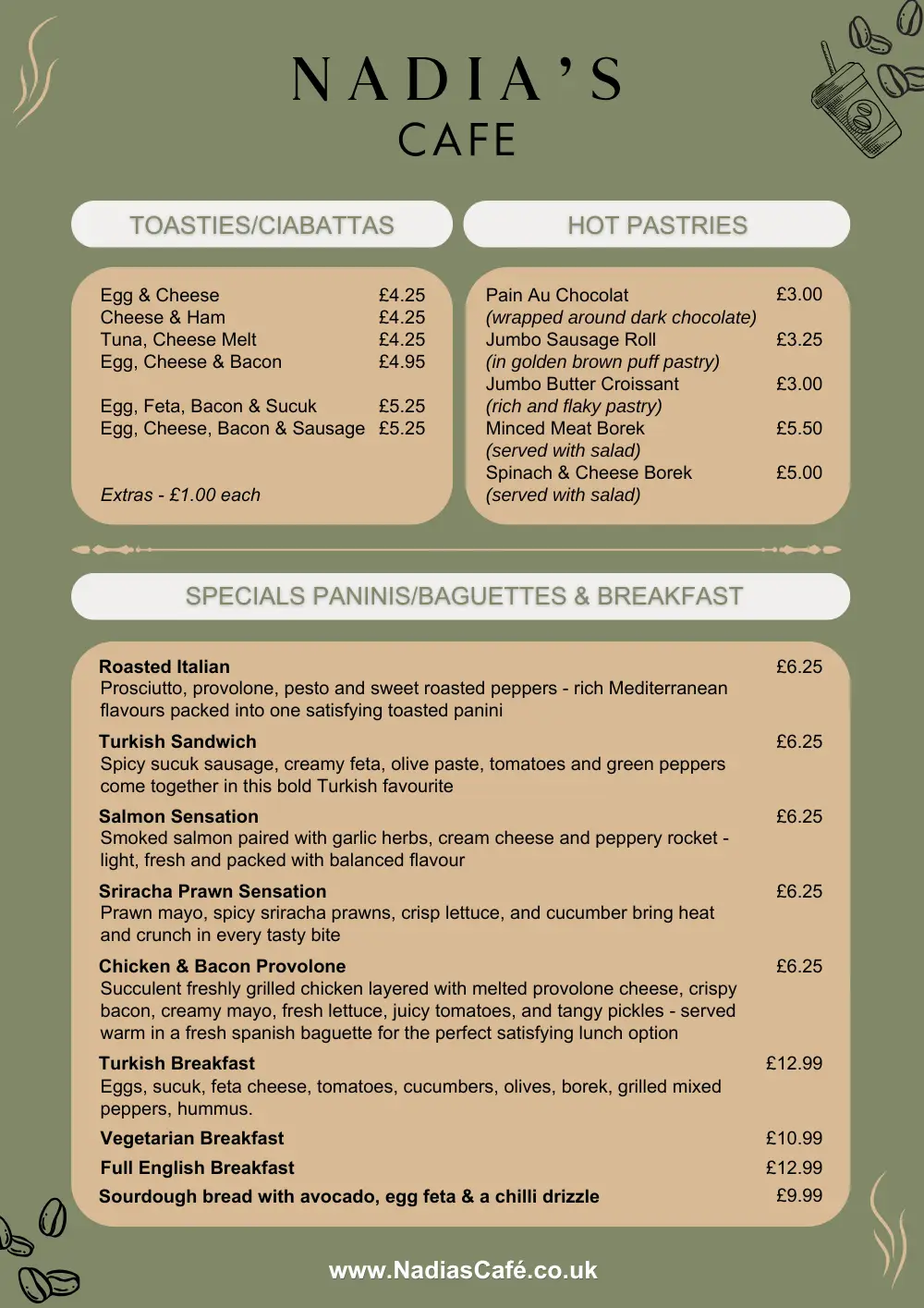 Our breakfast and brunch menu is crafted to bring warmth and flavour to every visit. From freshly toasted ciabattas to indulgent pastries, each item is made with care and local charm. Our signature specials—like the Turkish Sandwich and Chicken Provolone—offer a satisfying bite for every appetite. Whether you’re dining in or grabbing something quick, our morning menu is designed to fuel your day with comfort, taste, and a personal touch.