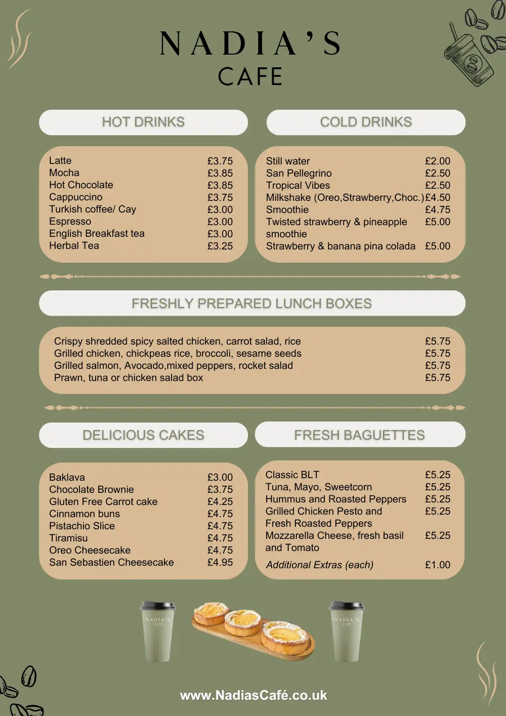 Nadia’s drinks and sweet treats menu is a celebration of bold flavours and comforting indulgence. Sip on freshly brewed coffee, sample a rich milkshake, or unwind with our iced favourites. Our cakes, smoothies, and baguettes offer something for every mood—light, hearty, or indulgent. Each item is handpicked to complement your experience at the café, making every visit a chance to discover something new and delicious in the heart of Harston.